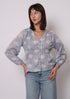 This detailed blouse features functional front buttons, long sleeves and a v neckline.