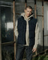 This black puffer vest features a combination of textures and a collar, making it an essential layering piece for cooler temperatures.