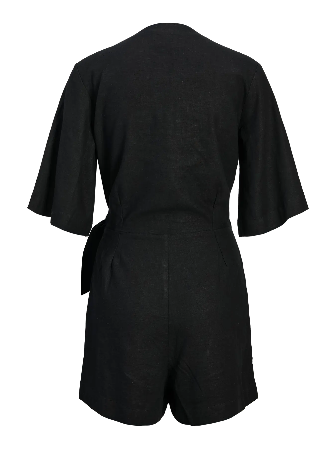 Sophisticated short-sleeved romper crafted in linen-style fabric featuring a V-neckline and waist-defining tie detail.