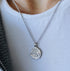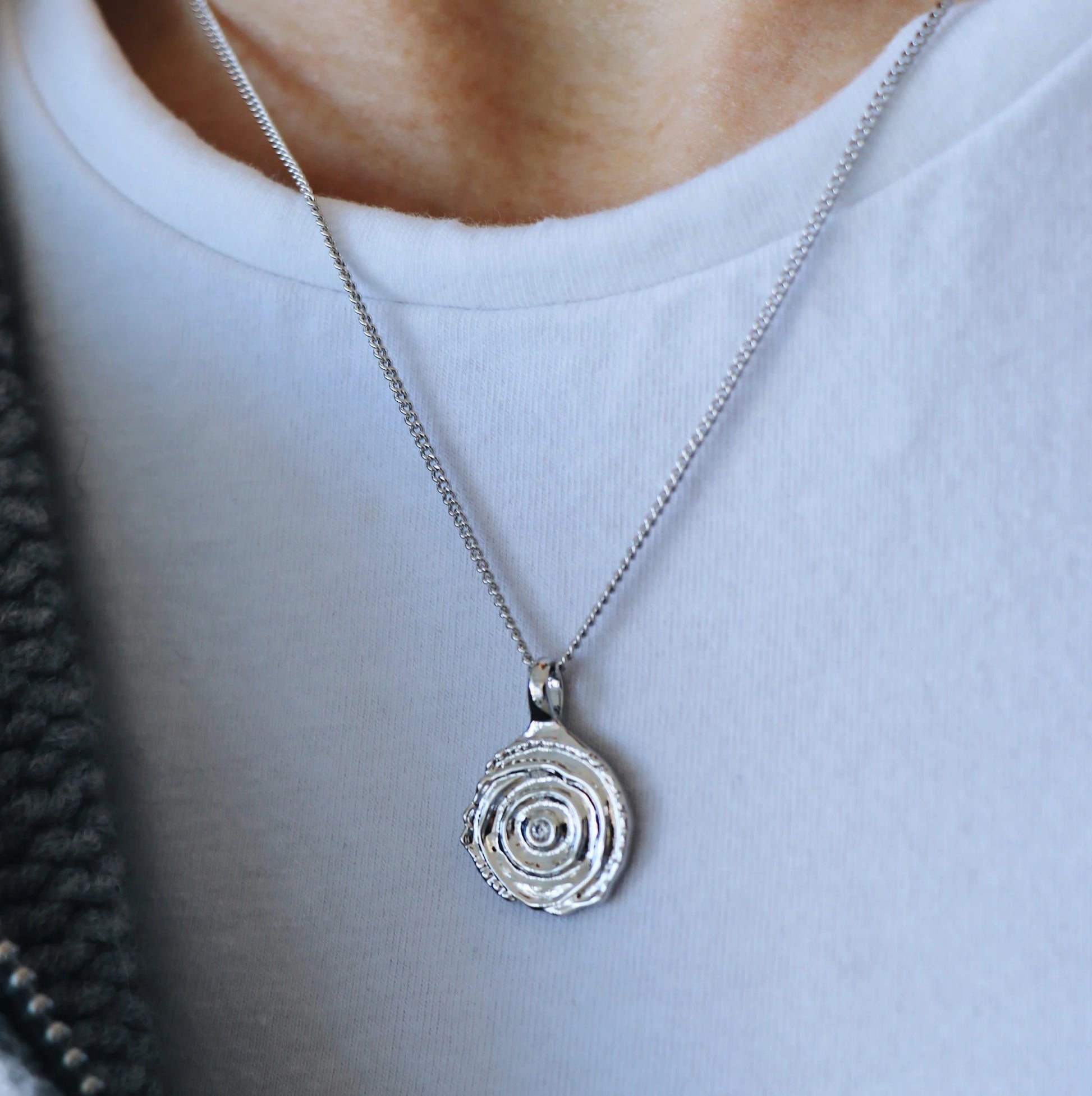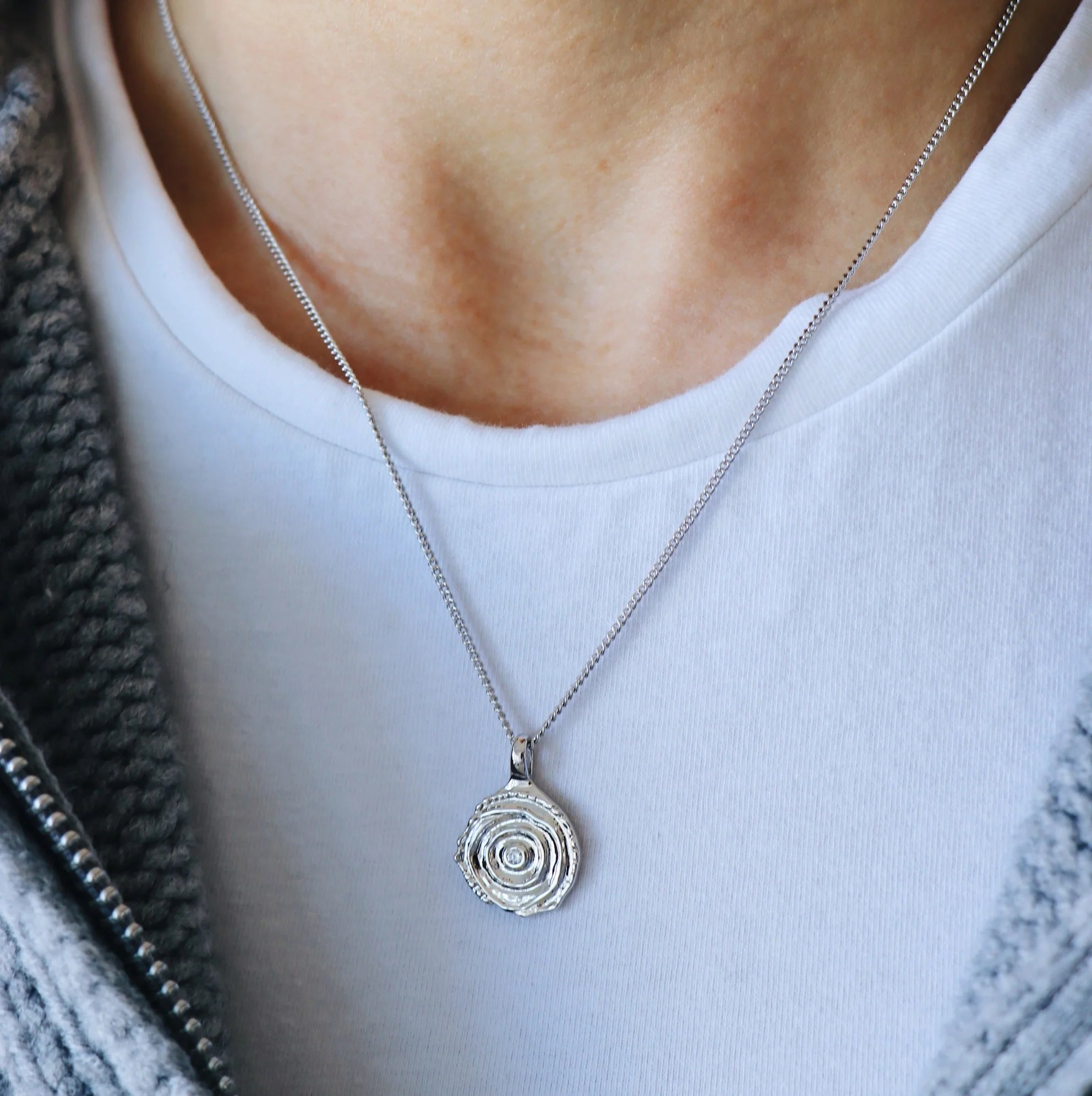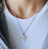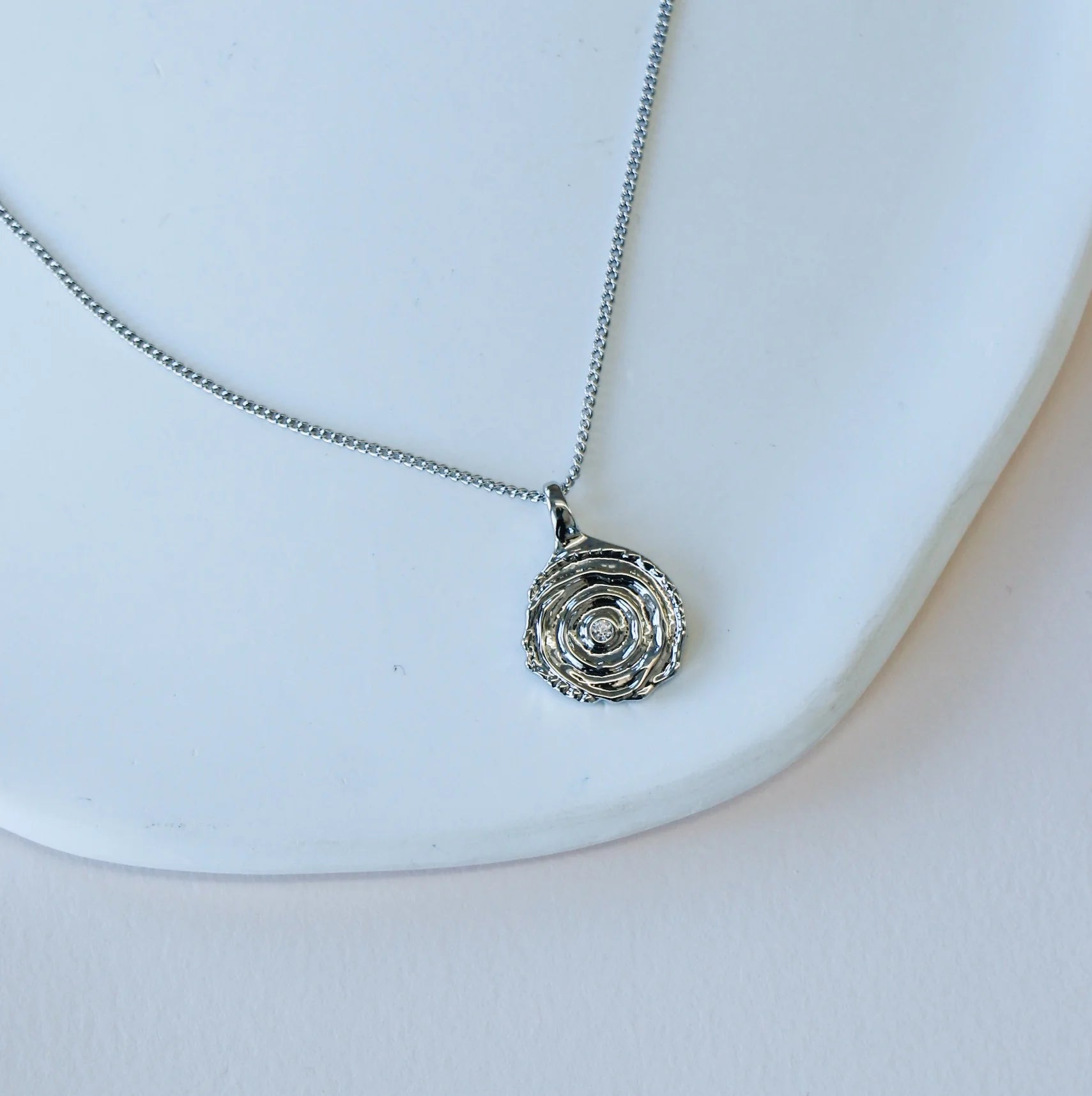 Necklace in flat link chain and textured pendant with light zircon in its center. Add a special touch to your outfits.