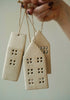 Materials & Composition: Handmade from ceramic with a matte cream finish, featuring three unique house designs.