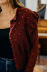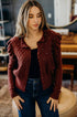This sophisticated crochet cardigan delivers timeless holiday elegance with its rich bordeaux hue and thoughtfully designed details.