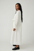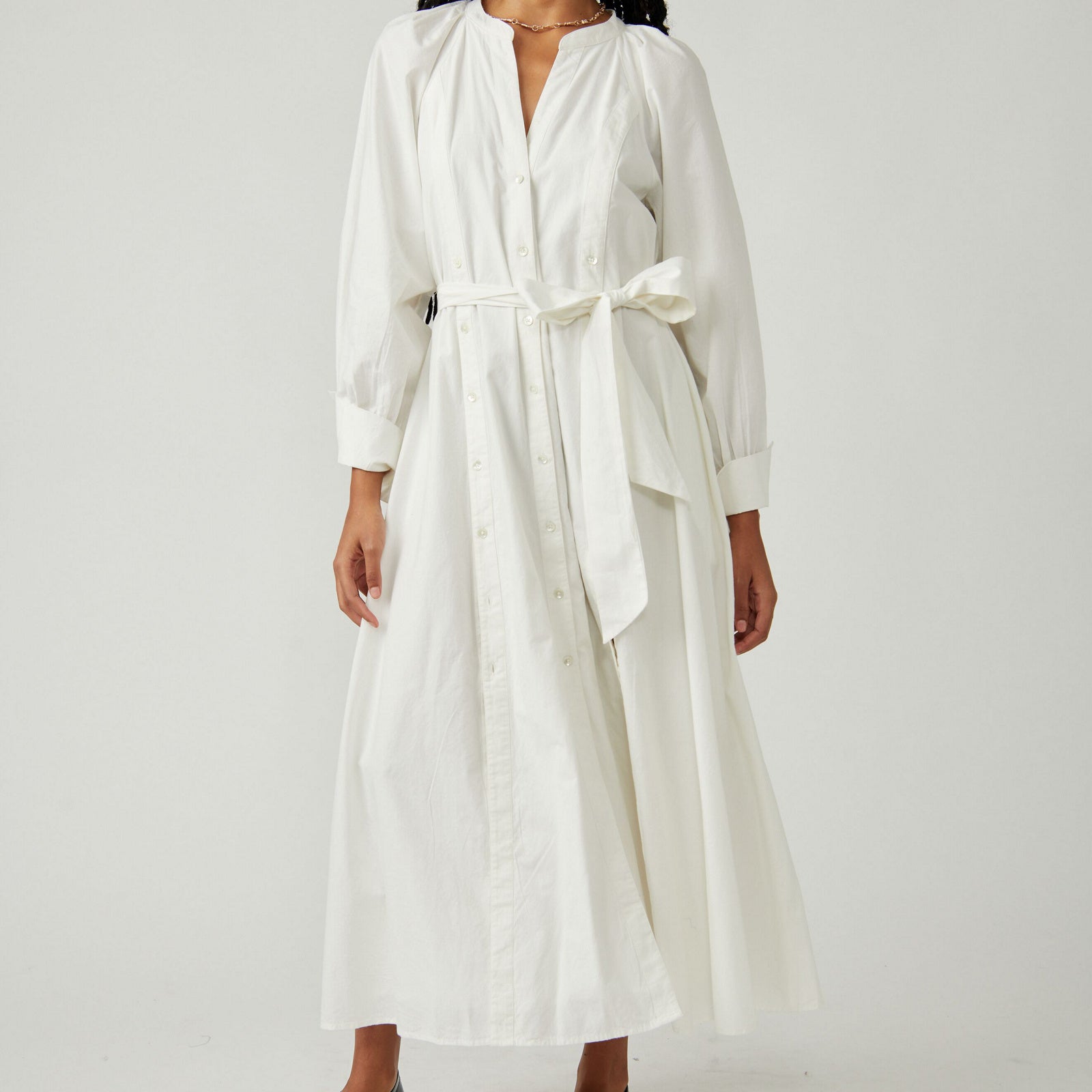 Featuring functional front buttons, maxi length, and tie at the waist.