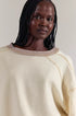 Washed burnout fleece fabrication, crew neckline, drop-shoulder ¾ length sleeves, exposed seams, ribbed trims