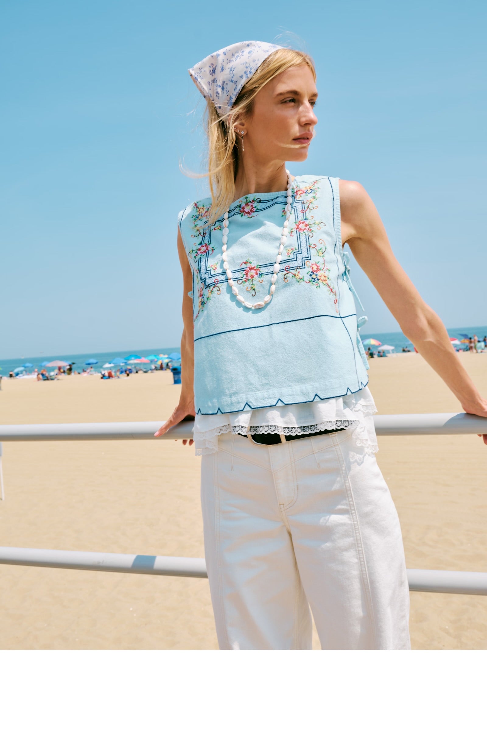 Features tie details on the sides, embroidery all over, square neckline on back and front.