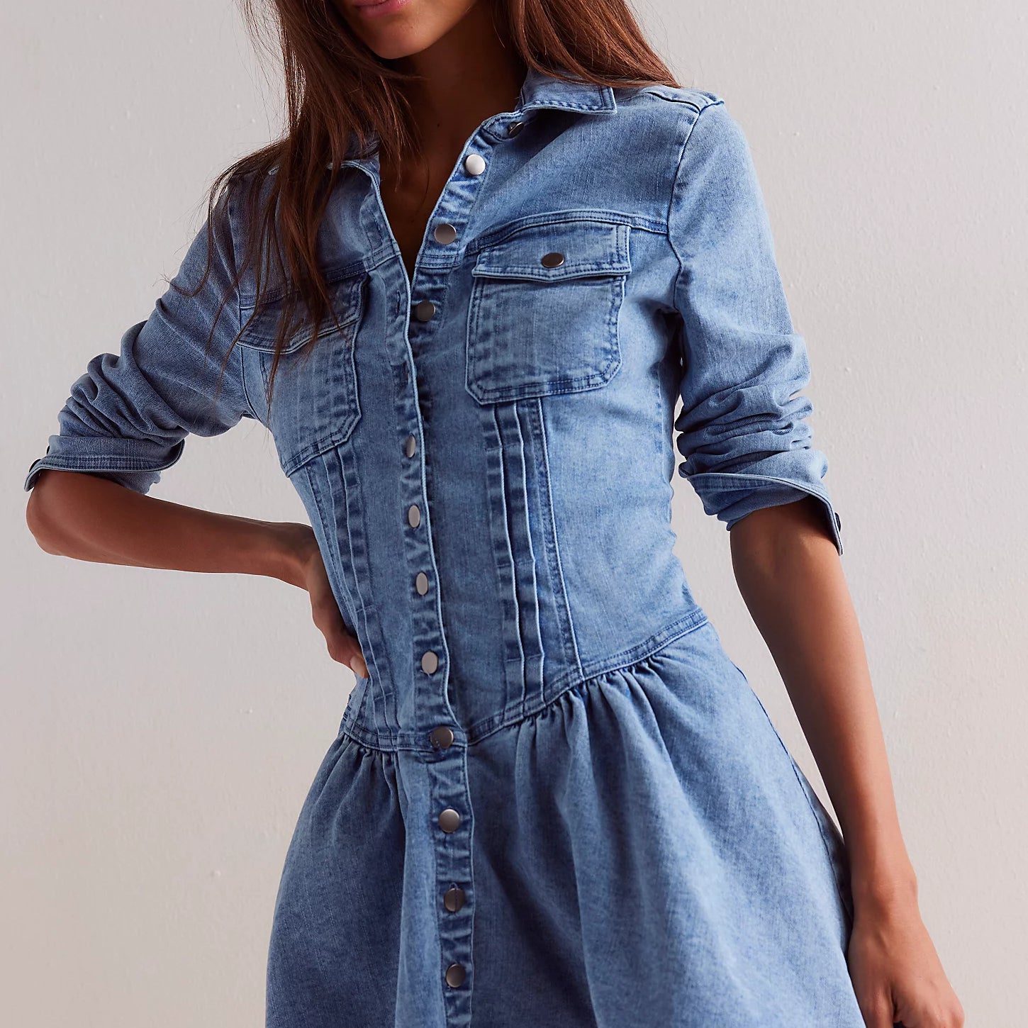 Features: Soft cotton denim with a stretchy feel, collared-neckline, button-front closures, chest-pocket detailing, defined seams throughout, flared skirt, cuffed long-sleeves.