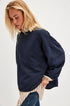 Soft ribbed knit fabrication, slight scoop neckline, dropped dolman sleeves with cuffed hems, raw trim throughout.