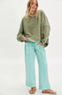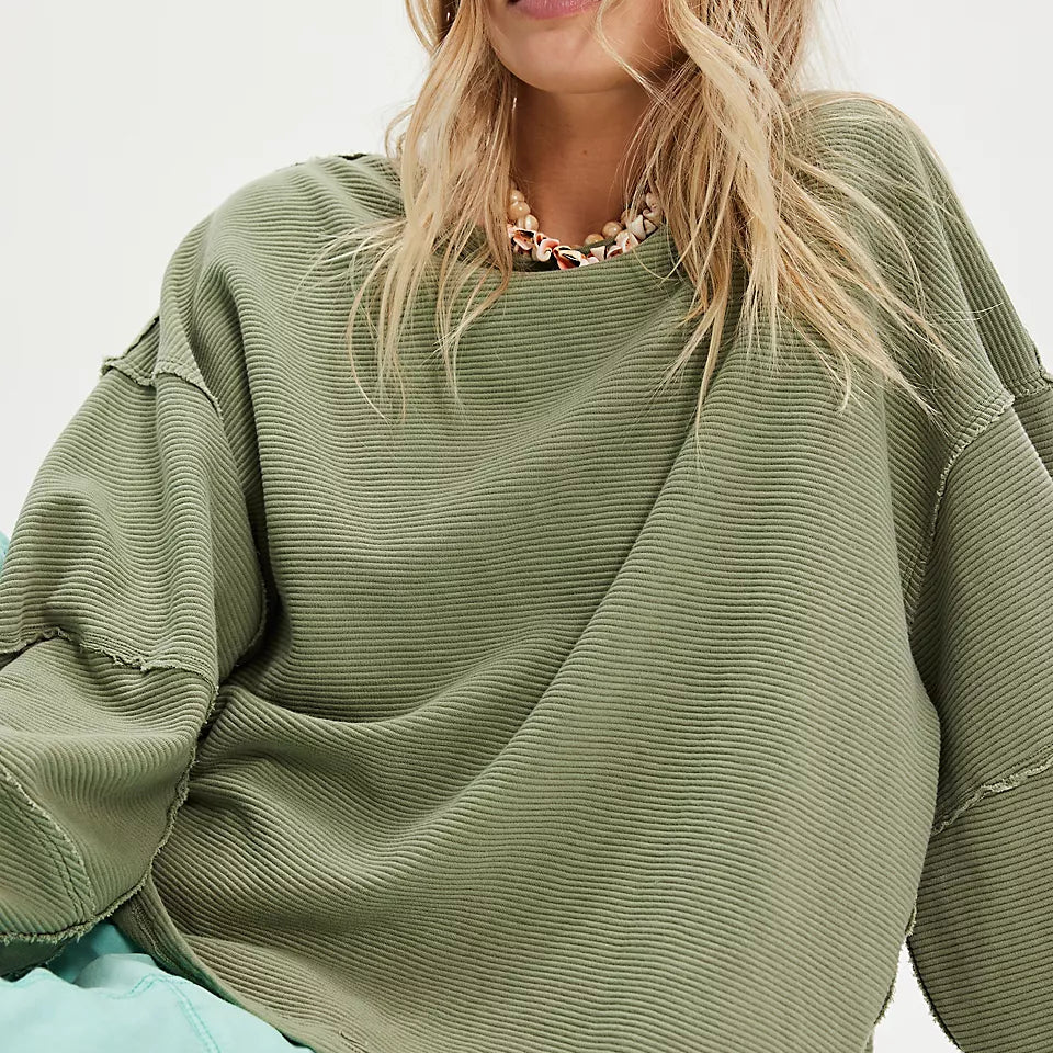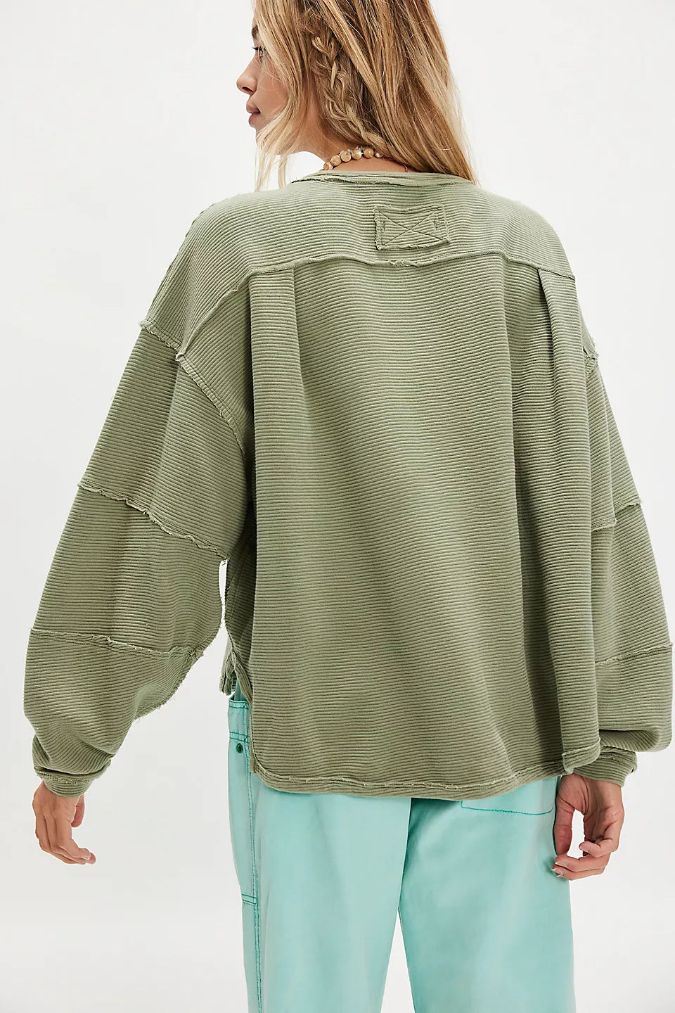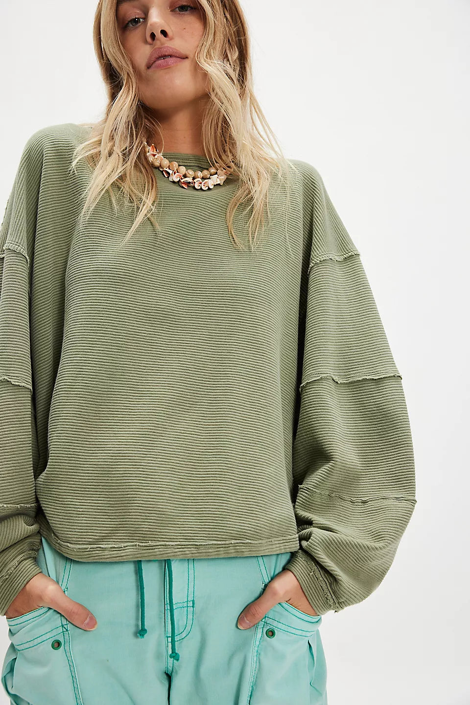 Soft ribbed knit fabrication, slight scoop neckline, dropped dolman sleeves with cuffed hems, raw trim throughout.