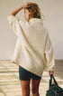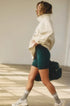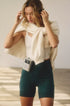 Pullover: Oversized silhouette; Shorts: High-rise, slim biker fit.
