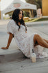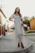 Mid-length dress with empire waist, v-neckline, and tiered sleeves.