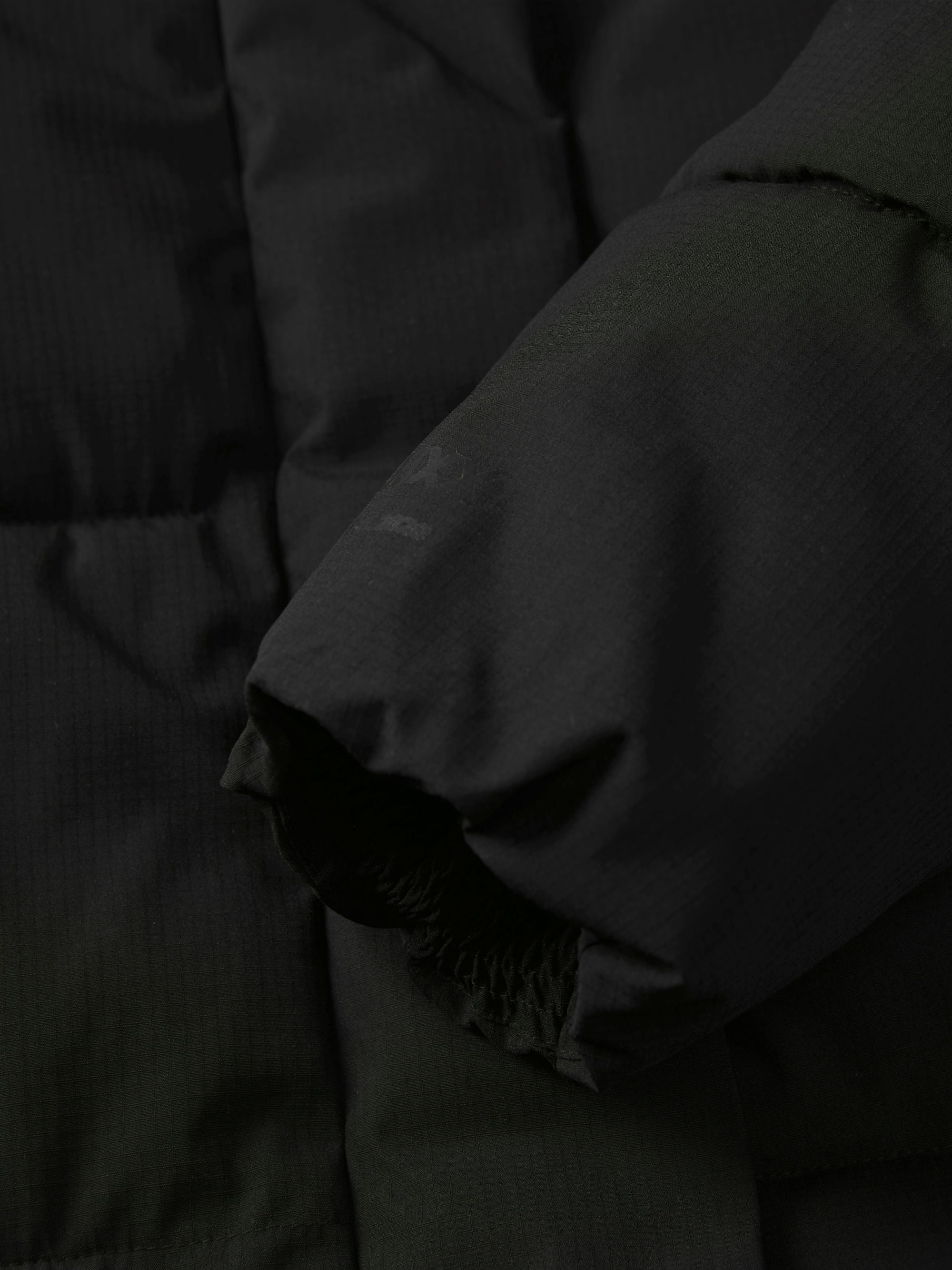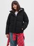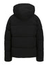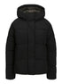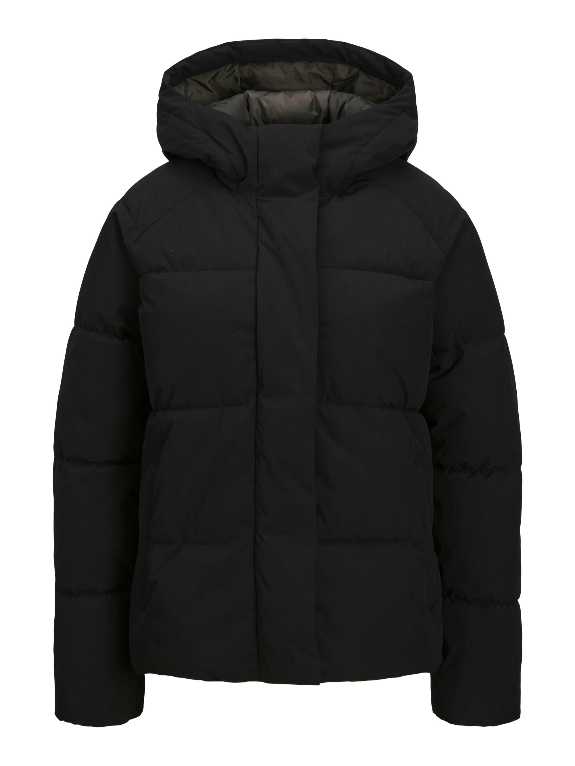 This insulated puffer jacket is designed for chilly weather, featuring a full-length zipper and an attached hood for added protection.