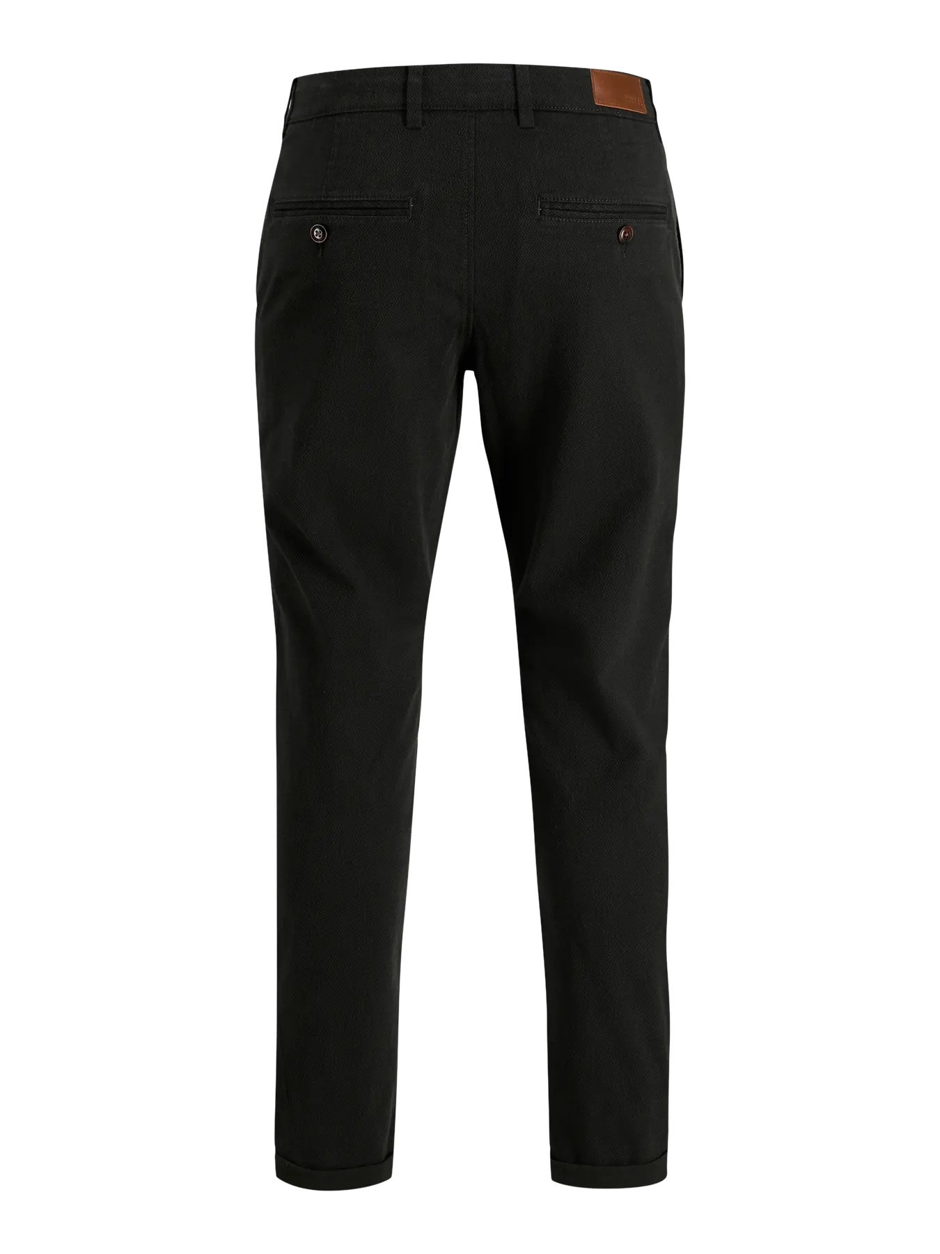 The chino pant is an essential style for this category. It is the in between of a dress pant and a casual 5 pocket styling. It's a plain styling, with front and back pockets only.