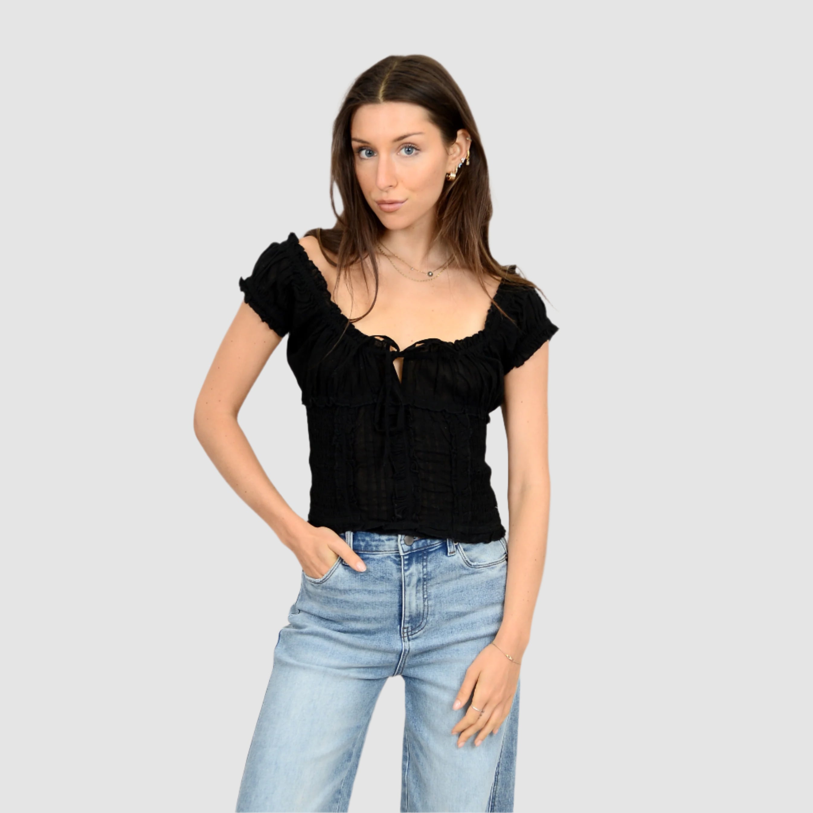 MICA PUFF SS SHIRRED TOP - BLACK