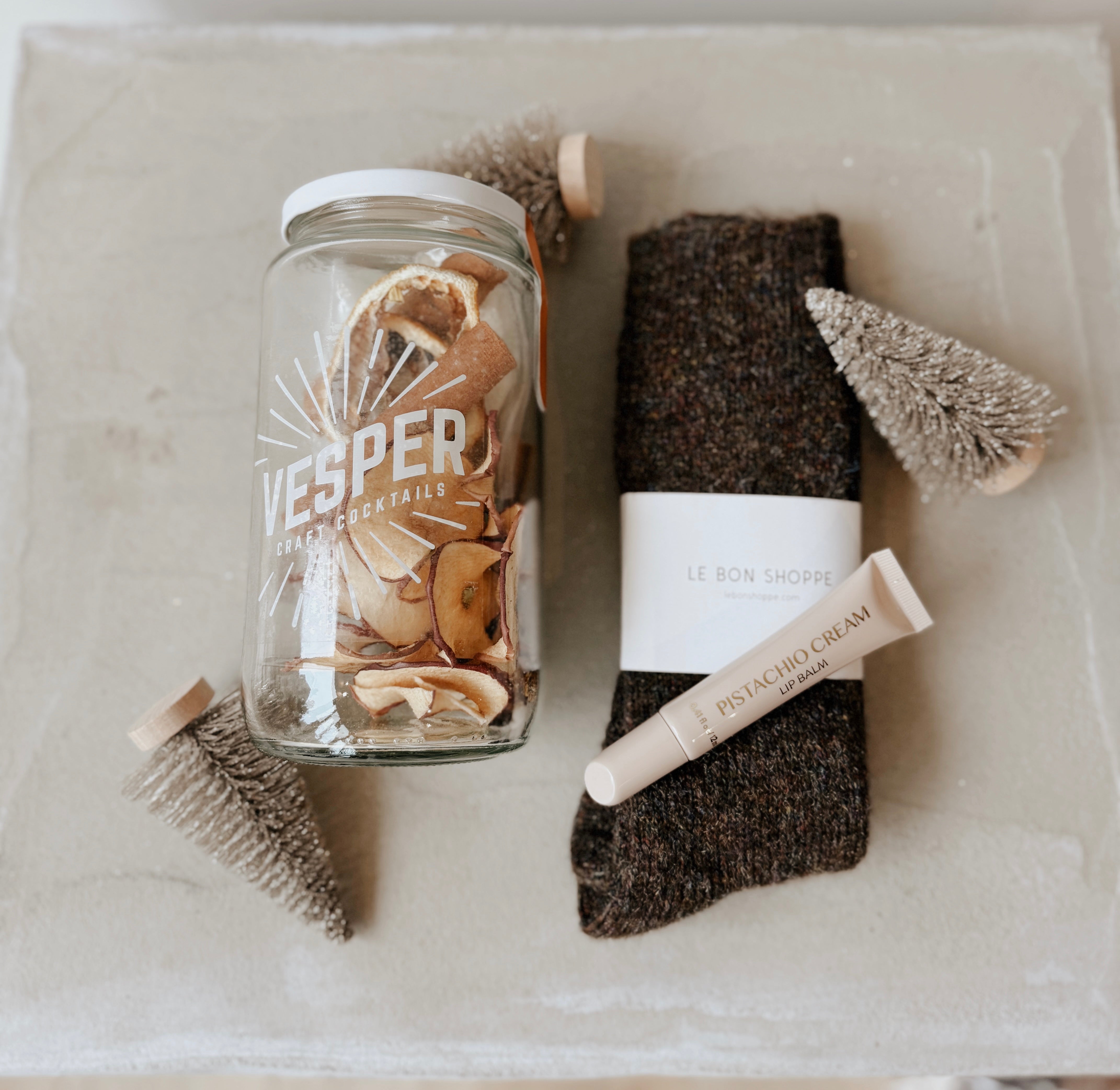 This On Trend gift set includes a bourbon apple cocktail mix by Vesper craft cocktails, a pair of margot socks , and a pistachio cream lip balm.