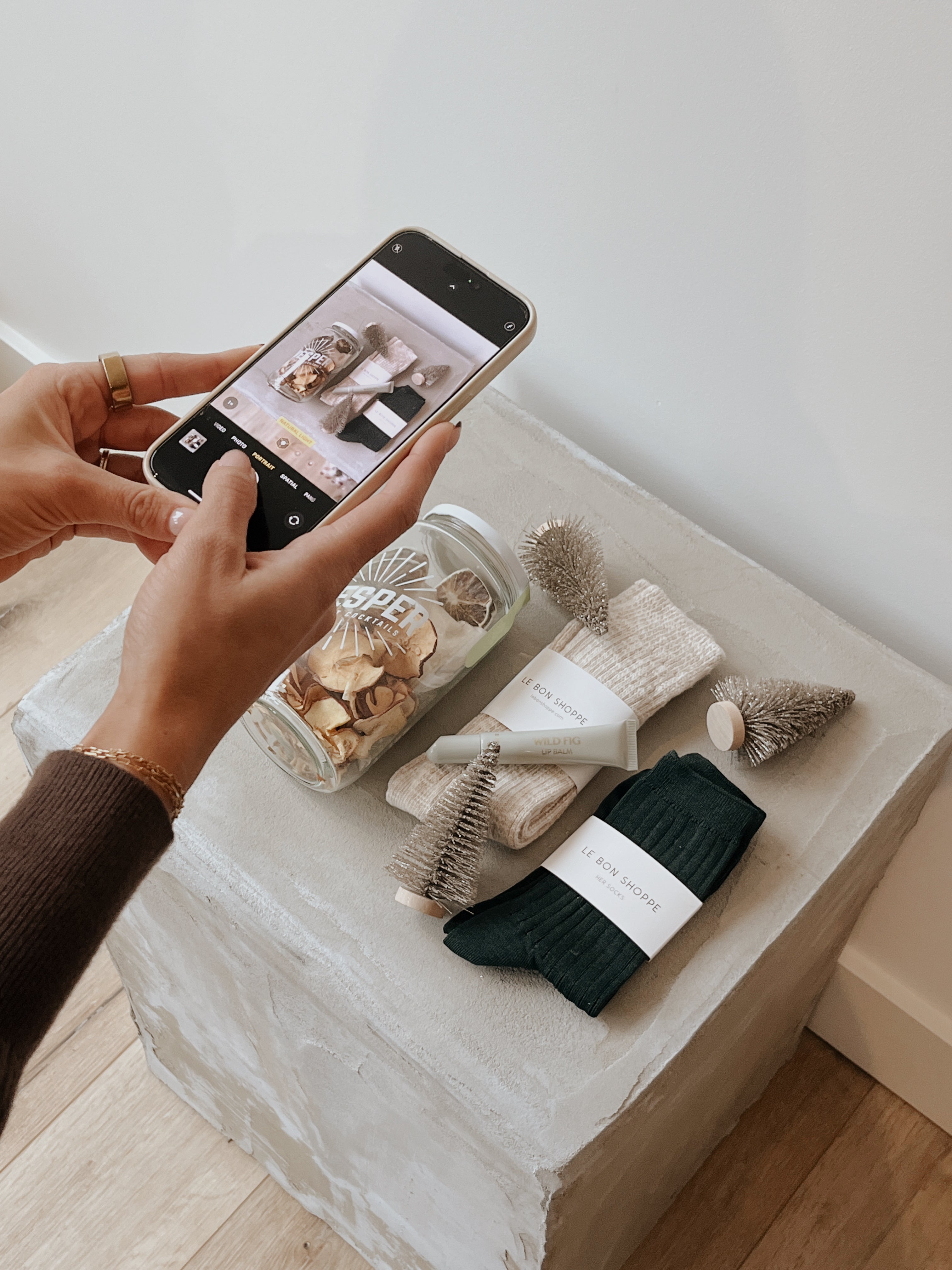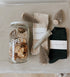 This On Trend gift set includes a Vesper cocktail mix for a lime mojito , cottage socks, her socks and a wild fig lip balm.
