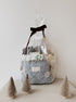 This On Trend gift set includes a quilted pouch ($62) , crochet claw clip ($15) , wood brush ($25) handmade snowflake soap bar by SOAK ($15) , denim colour sneaker socks ($16), blue boyfriend socks ($20), mini gold Christmas tree ($5) and a mini unscented candle ($3).