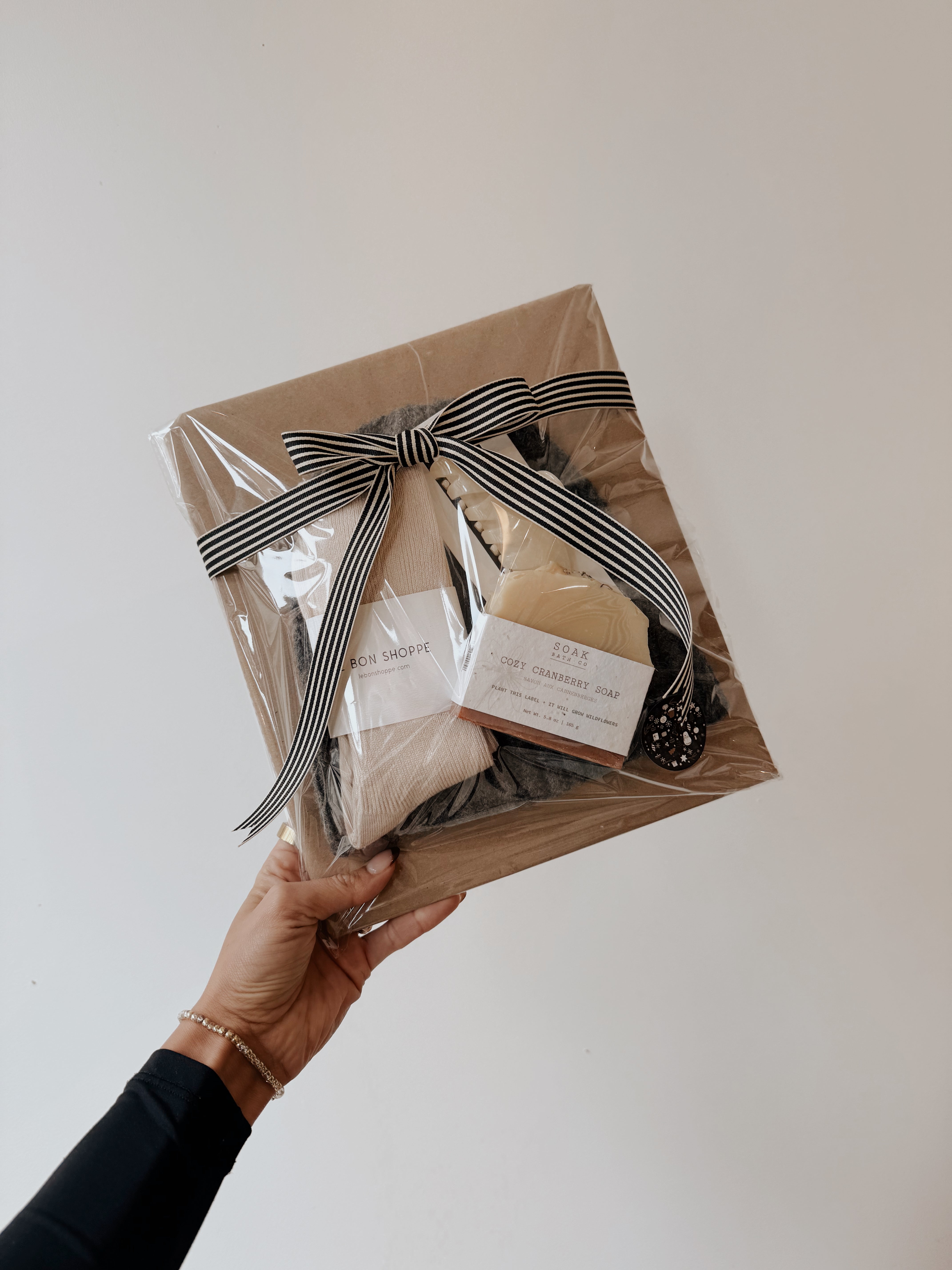 This On Trend gift set includes a knit beanie, a pair of trouser socks, a giant claw clip and a bar of handmade soap by SOAK.