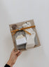 This On Trend gift set includes heather grey beanie by Vero Moda, a pair of ruffle socks by Free People, and a bar of handmade soap by SOAK.