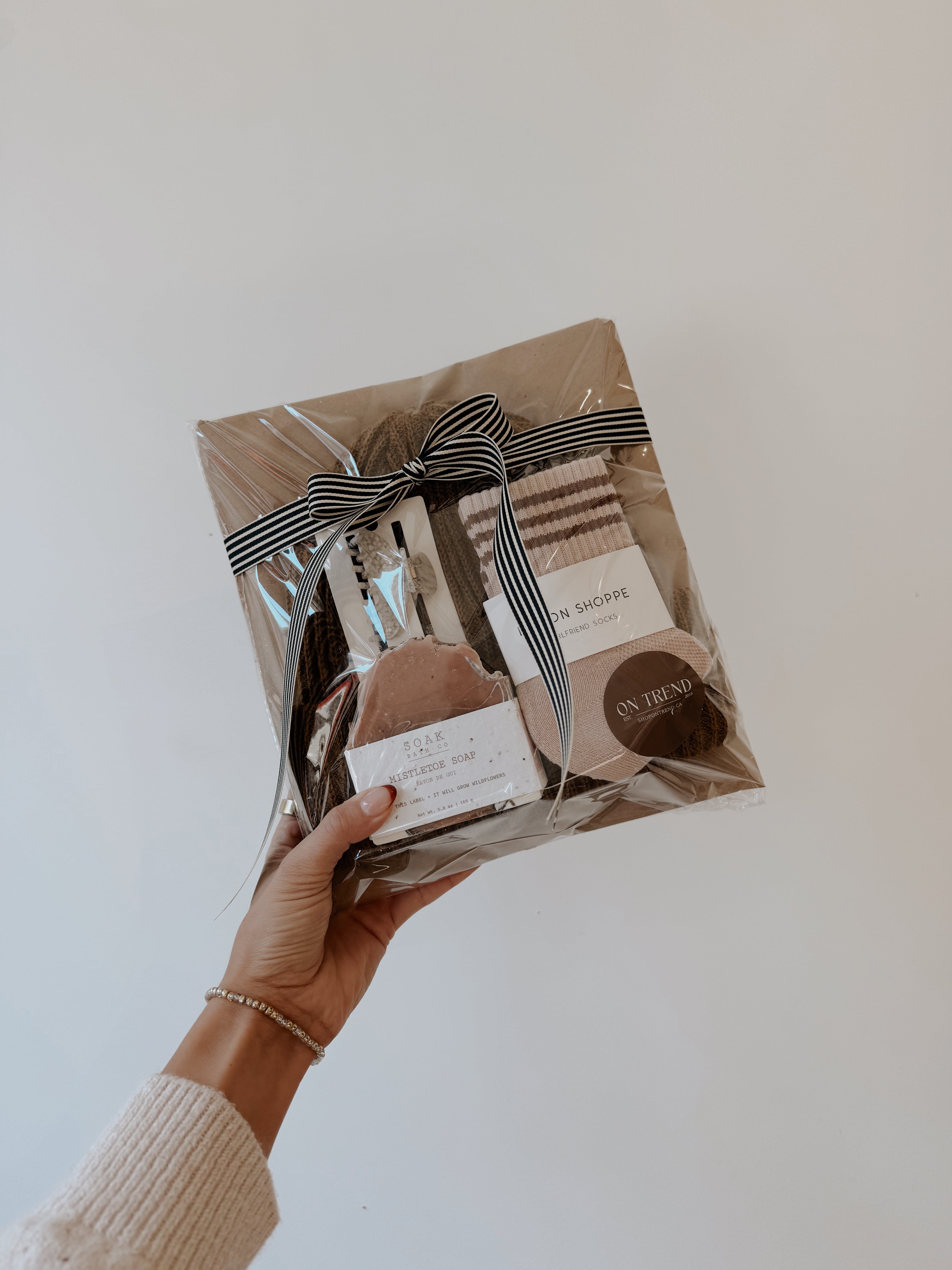 This On Trend gift set includes a knit beanie , pair of girlfriend socks, handmade bar of soap and a mini claw clip.