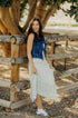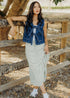 Denim vest with tie, round neckline, and pockets.