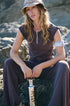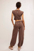 Soft, jersey fabrication; relaxed fit; cropped muscle tee top with seaming detail; ankle length pant with high-rise waist and wide leg; elasticated waistband and cuffs; crossover detail on top; ribbed collar; side seam pockets.