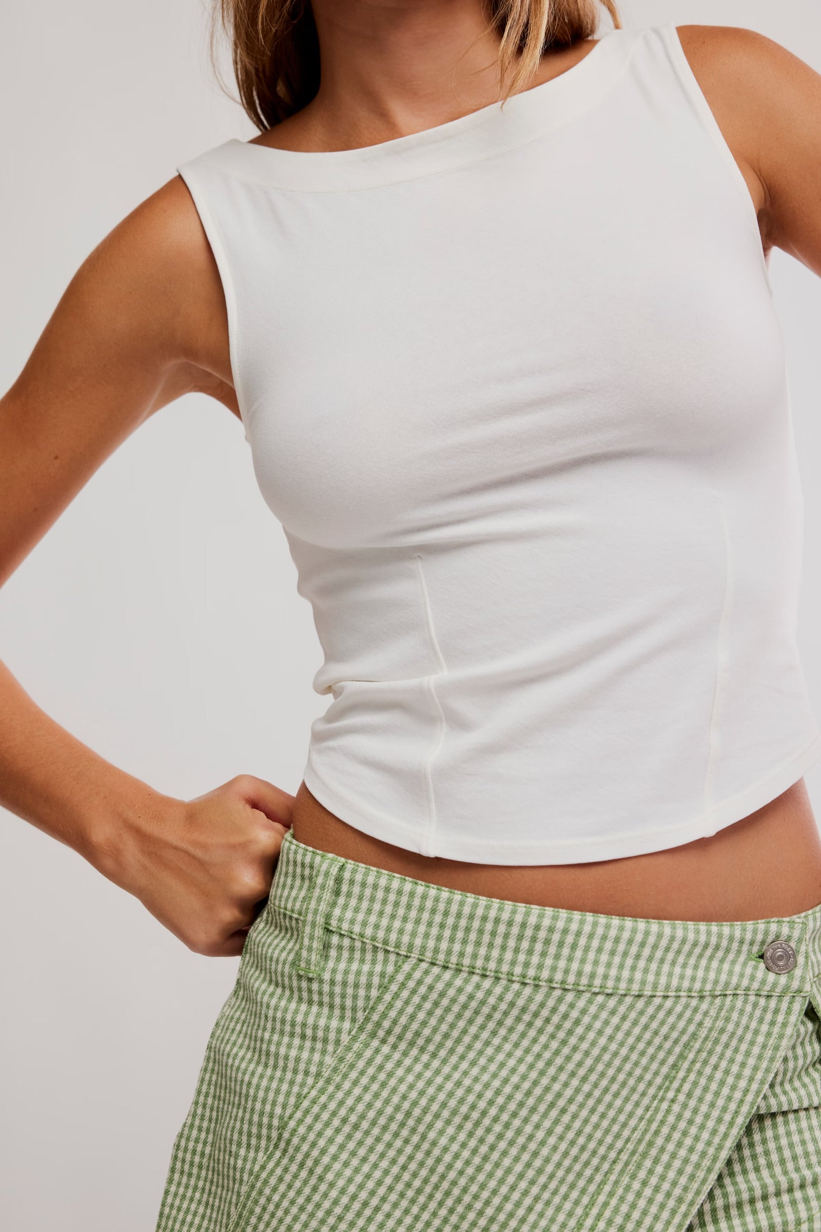 Effortlessly essential, this flattering tank features a fitted silhouette, a soft cotton-blend fabrication, and a classic boat neckline. Style solo or layer under a button-up for a timeless design.