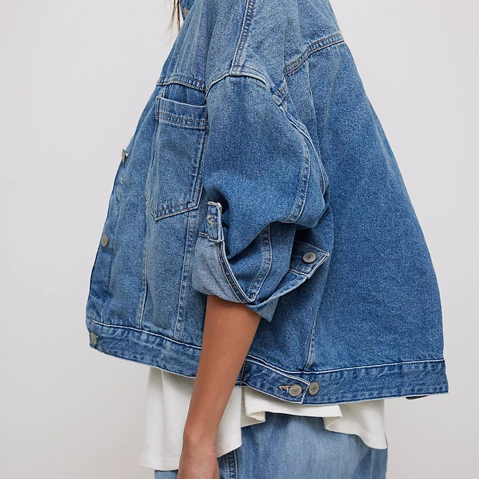 Take your denim jacket game to the next level with this so cool version featuring dropped shoulders for shape and defined pleating at back for an added special, swingy touch.