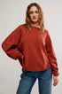 Soft ribbed knit fabrication, slight scoop neckline, dropped dolman sleeves with cuffed hems, raw trim throughout.