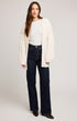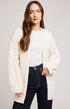 The Betty cardigan is made of a fuzzy yarn with a lofty feel. Features include various cable knit stitch patterns and a rolled sleeve hem detail.