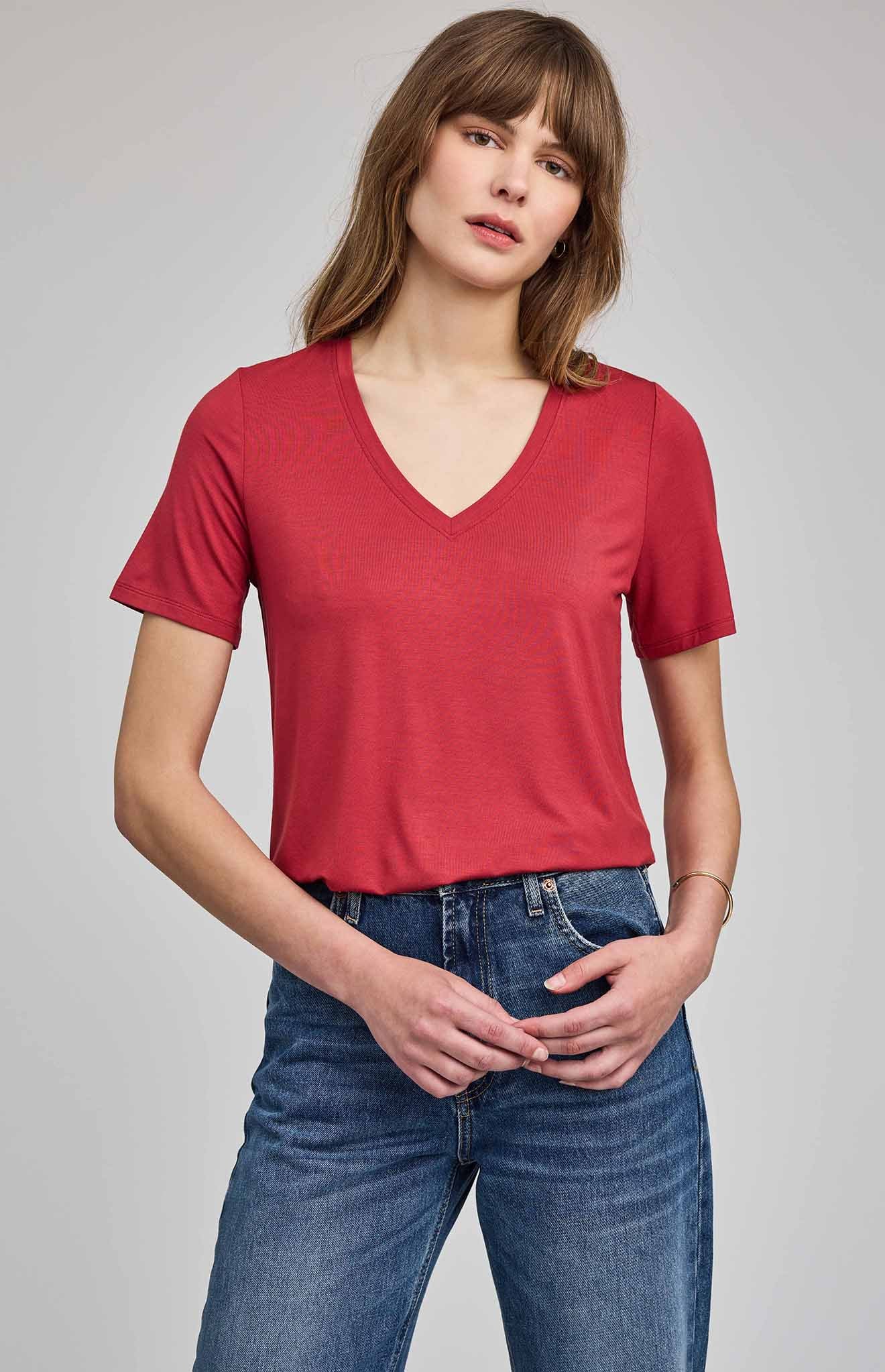 The Jamie t-shirt is made of super soft EcoVero rayon jersey. Features include a v-neckline and relaxed fit that is perfect for everyday wear.