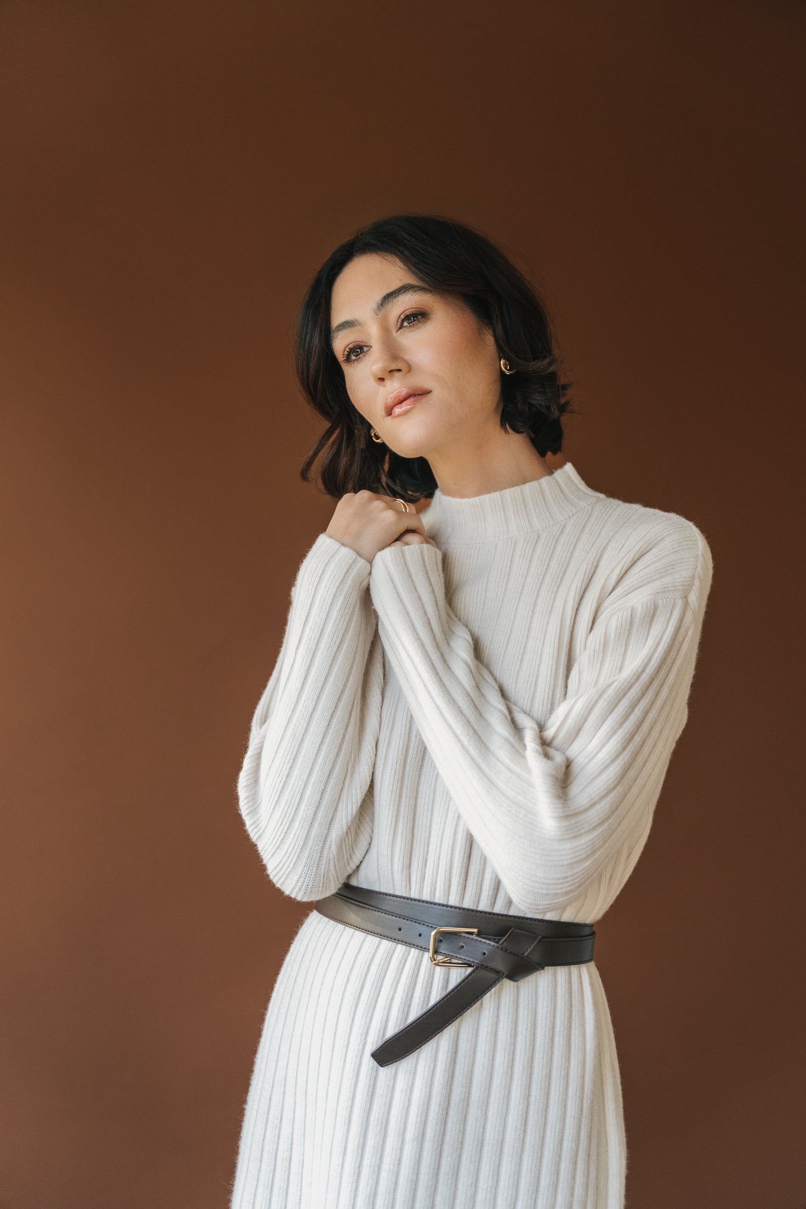 A must-have sweater dress for any closet. Featuring a ribbed texture and a relaxed silhouette, it offers both comfort and style. Easily elevate your outfit by adding a belt and boots for a polished appearance.