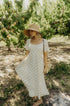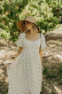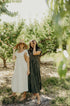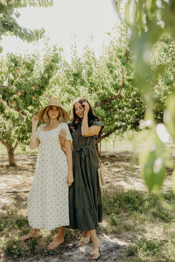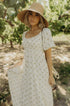 Maxi length dress with natural waist, smocked bodice, v neckline, and puff sleeves.