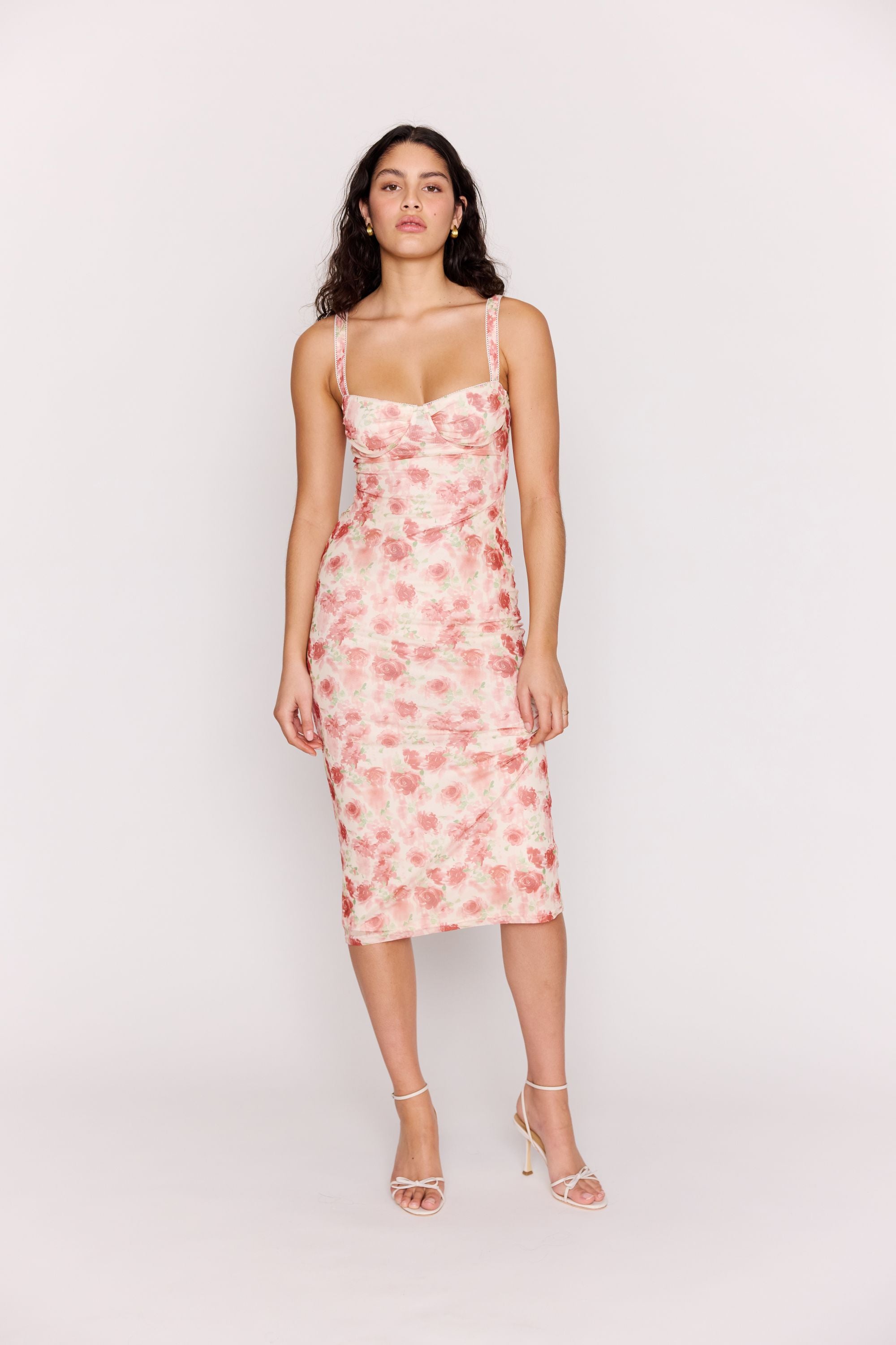 This refined knee-length dress showcases a romantic floral print on fitted mesh fabric with a structured bustier bodice.