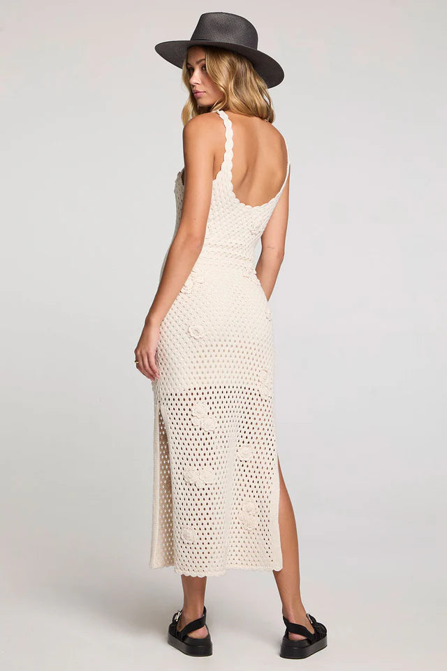 Featuring scalloped edge detailing, a cheeky sheer look, and a 3D flower pattern, this dress exudes a surfer girl chic vibe.