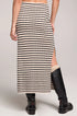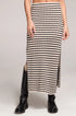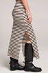 The Suzi Midi Skirt features a simple, straight woven silhouette adorned with an elegant black and white striped pattern.