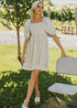 Knee length dress with empire waist, puff sleeves, square neckline, and pockets.