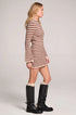 Featuring warm brown and cream stripes, bell sleeves, and a faux turtleneck, this dress captures timeless French girl elegance.