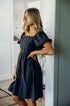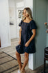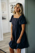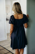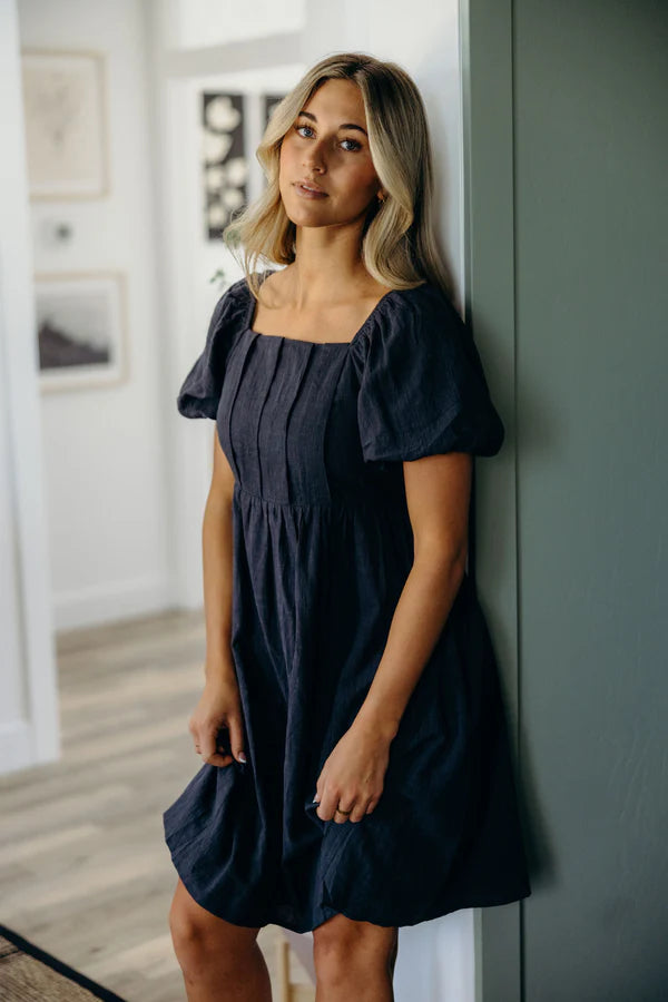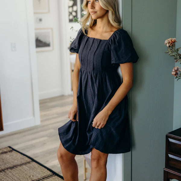 Knee length dress with natural waistline, pleated bodice detail, elastic waist in back, square neckline and puff sleeves.