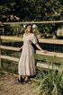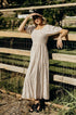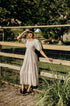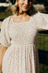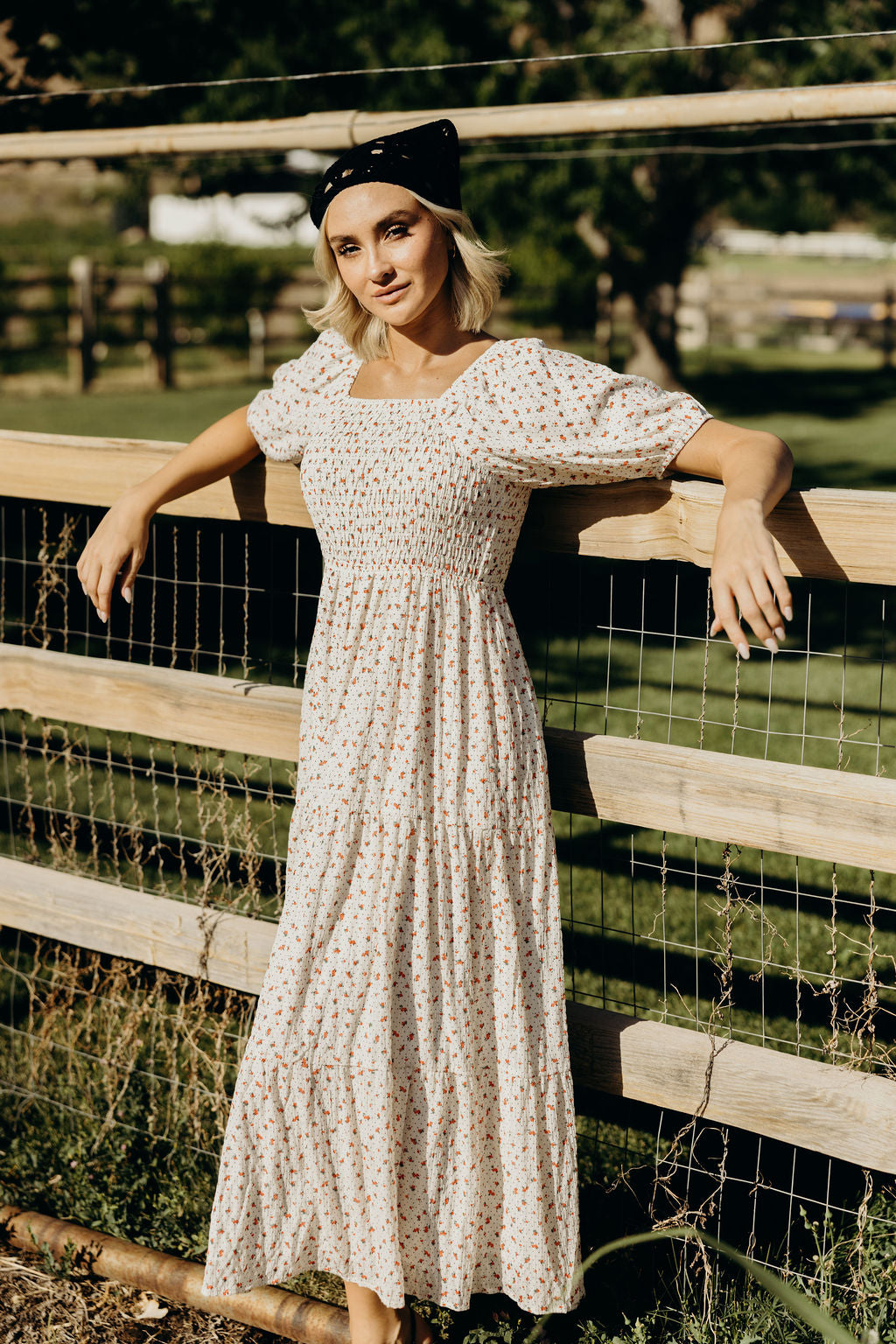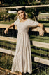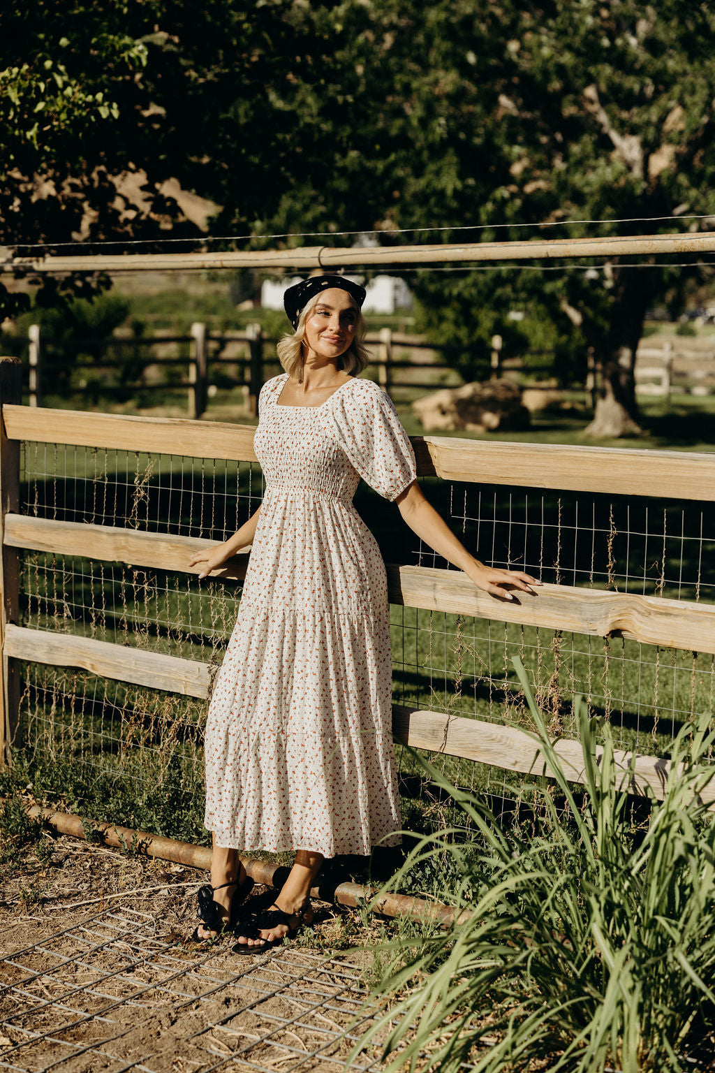Midi length dress with tiered skirt, smocked bodice, square neckline, and puff sleeves.