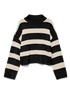 This striped pullover features a cropped length ideal for pairing with high-waisted bottoms. It offers a relaxed fit with a high neckline, combining cozy comfort with stylish appeal.
