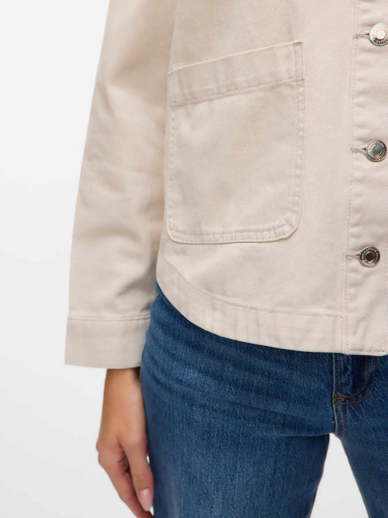 This versatile denim shacket in a soft birch tone serves as an essential layering piece for transitional seasons.