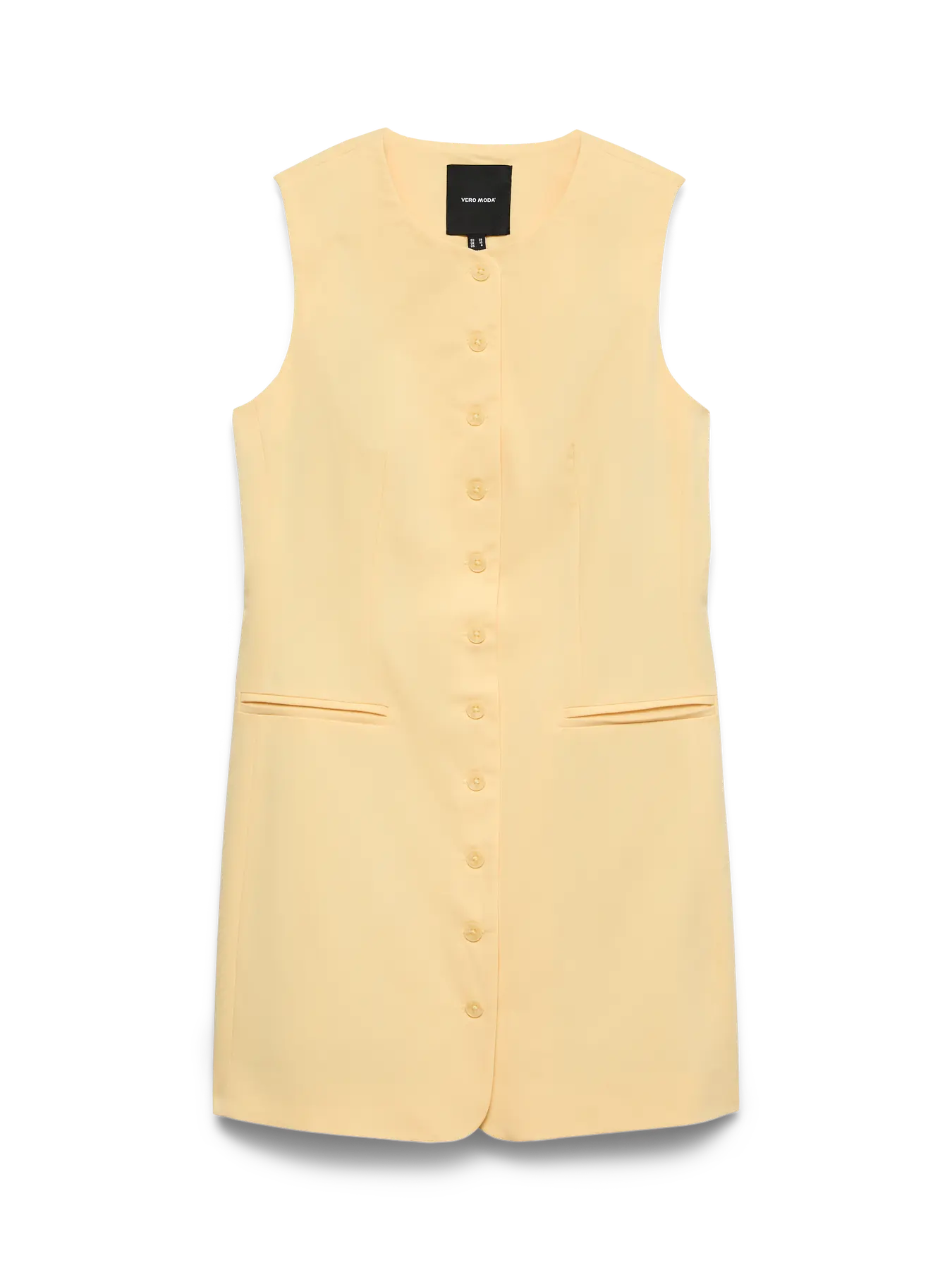 This cutie mini sleeveless blazer style dress features a fully functional buttoned front, slit pockets and a high neckline.